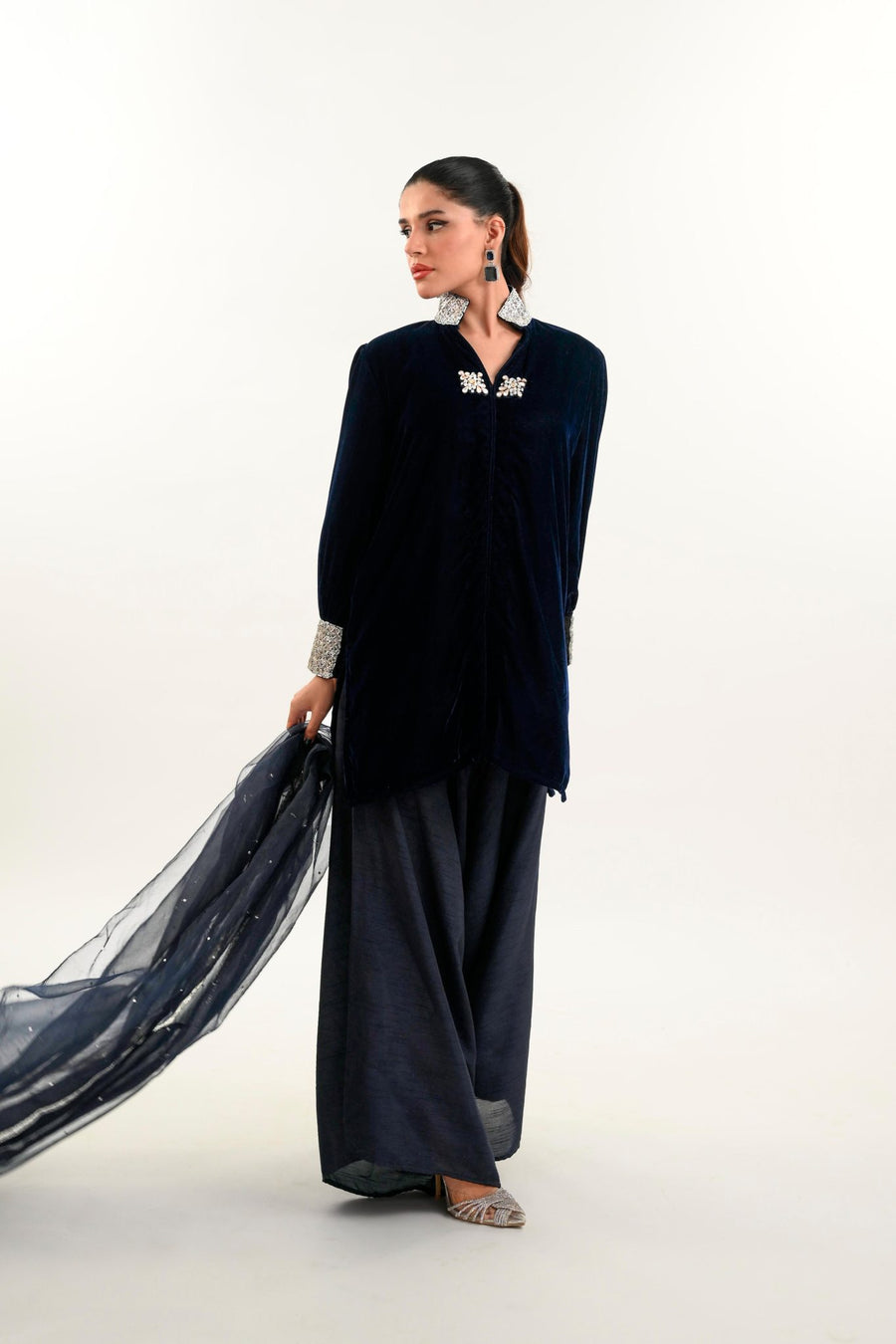 A striking green velvet shirt intricately adorned with zari, tilla, dabka, and sequins embroidery. The neckline is delicately handworked , while booti details grace the sleeves for a refined touch....