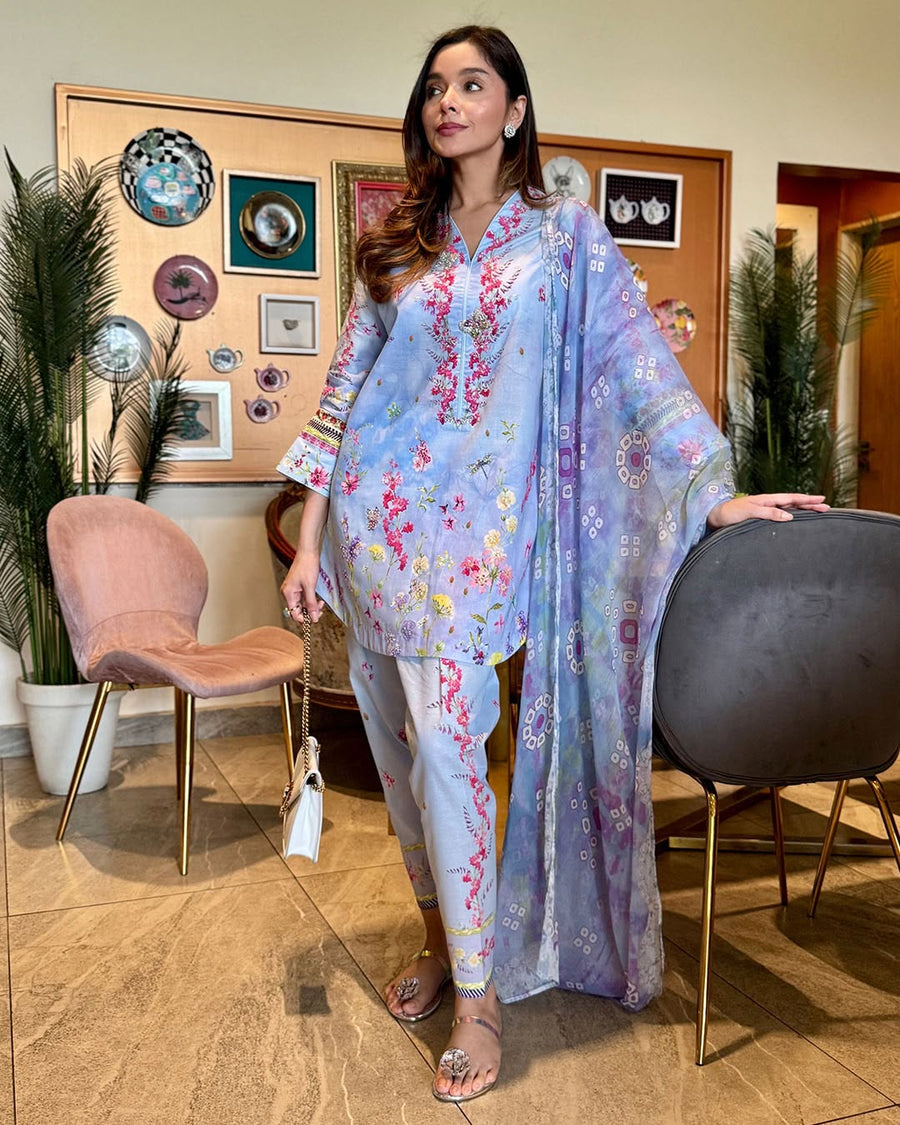 A deep midnight-blue velvet set embellished with shimmering blue sequined florals. Paired with a soft velvet shalwar, Glacier offers a luminous, winter-ready elegance perfect for evening wear.  Model is 5...