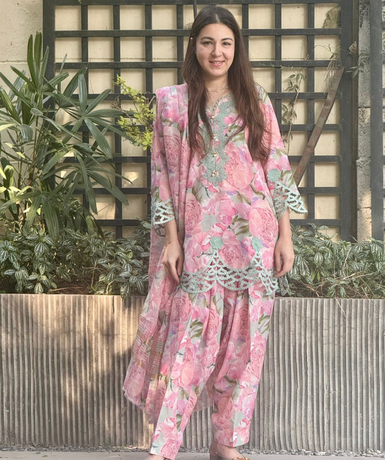 A classically chic composition is portrayed on this style statement outfit. It features a contemporary shirt beautifully adorned with captivating floral designs embroidered with intricate details illustrating schiffli technique portrayed...