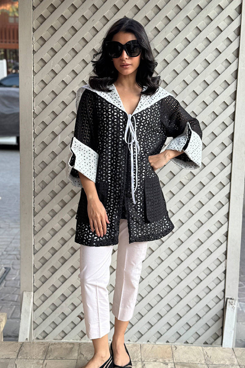 Blend night-time elegance with artisanal charm. Crafted in plush black velvet, this tunic features intricate embroidered florals, voluminous statement sleeves, and delicate button detailing with a graceful keyhole back. Paired...