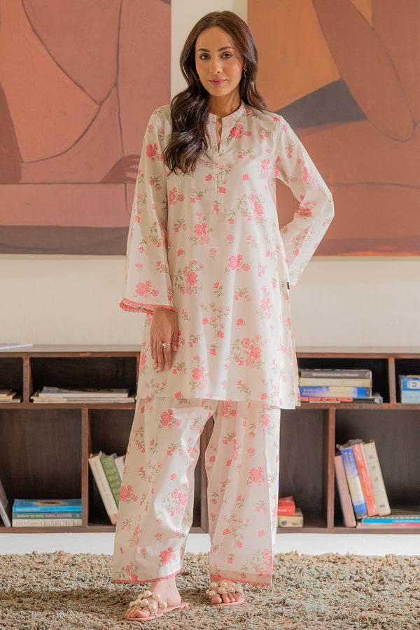 A two-piece printed set on a crisp white base, adorned with vibrant multicolour motifs and delicate 3D flowers. The neckline is kept clean, while the hem, sleeves, and farshi shalwar...