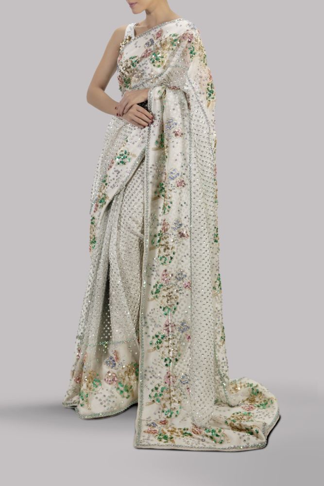 BONNIE BLUE ORGANZA SARI WITH MATCHING EMBELLISHED CROPPED BLOUSE. HAND EMBELLISHED WITH FRESHWATER PEARLS, INTRICATE GLISTENING SEQUIN WORK, DAZZLING CRYSTALS AND GOLD BEADS. THIS SENSATIONAL SARI IS NO EXCEPTION. THIS...