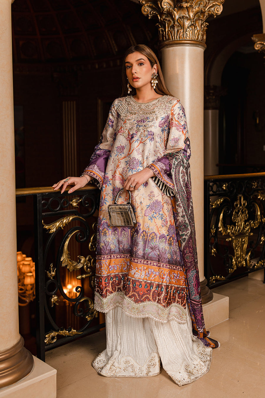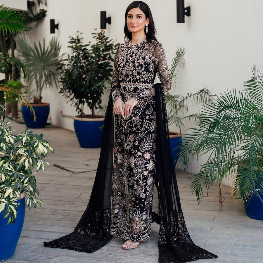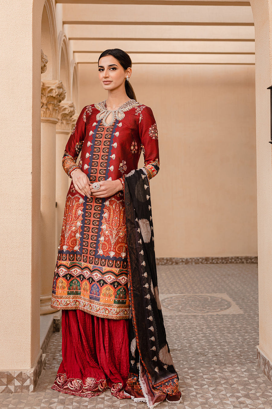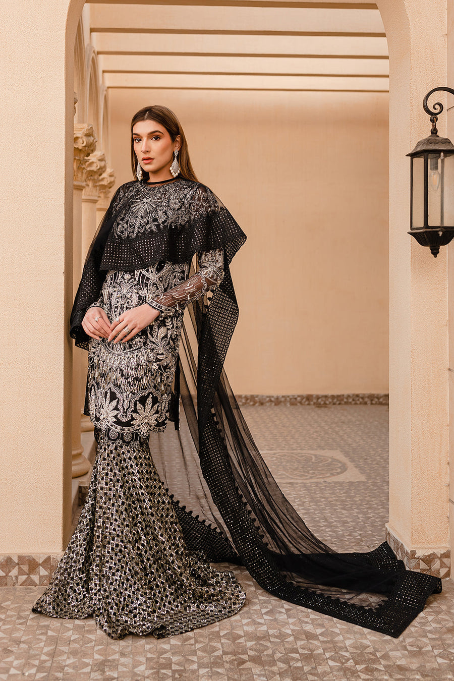 Beautifully done on the moon-grey canvas, Dilan features a front-open peplum silhouette styled with the sharara and ruffled dupatta for the classic fusion which makes it a perfect fit for...
