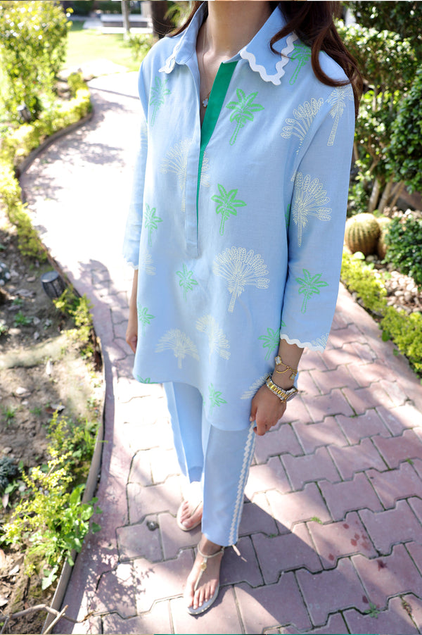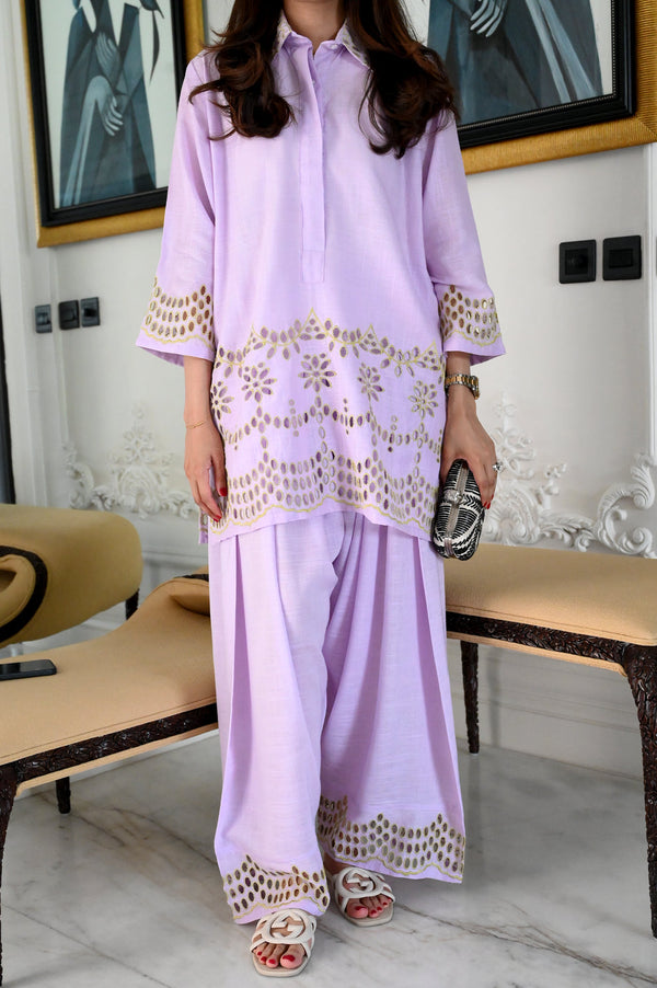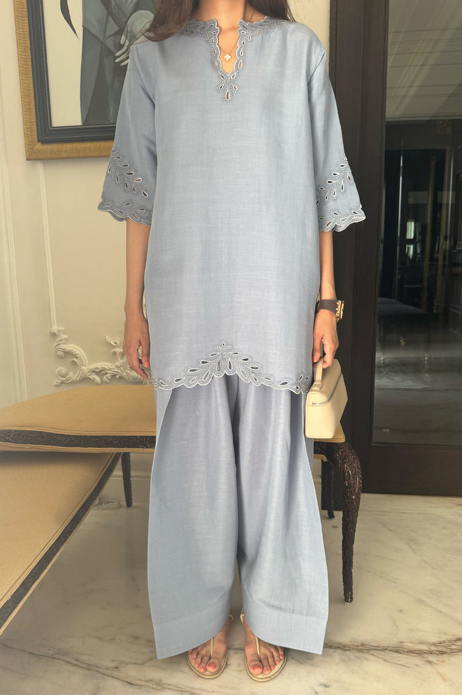 A rich midnight-blue velvet set designed with statement gold buttons and a relaxed silhouette. Paired with our signature NiaMia cut shalwar, Aurora brings a bold yet refined charm to winter...
