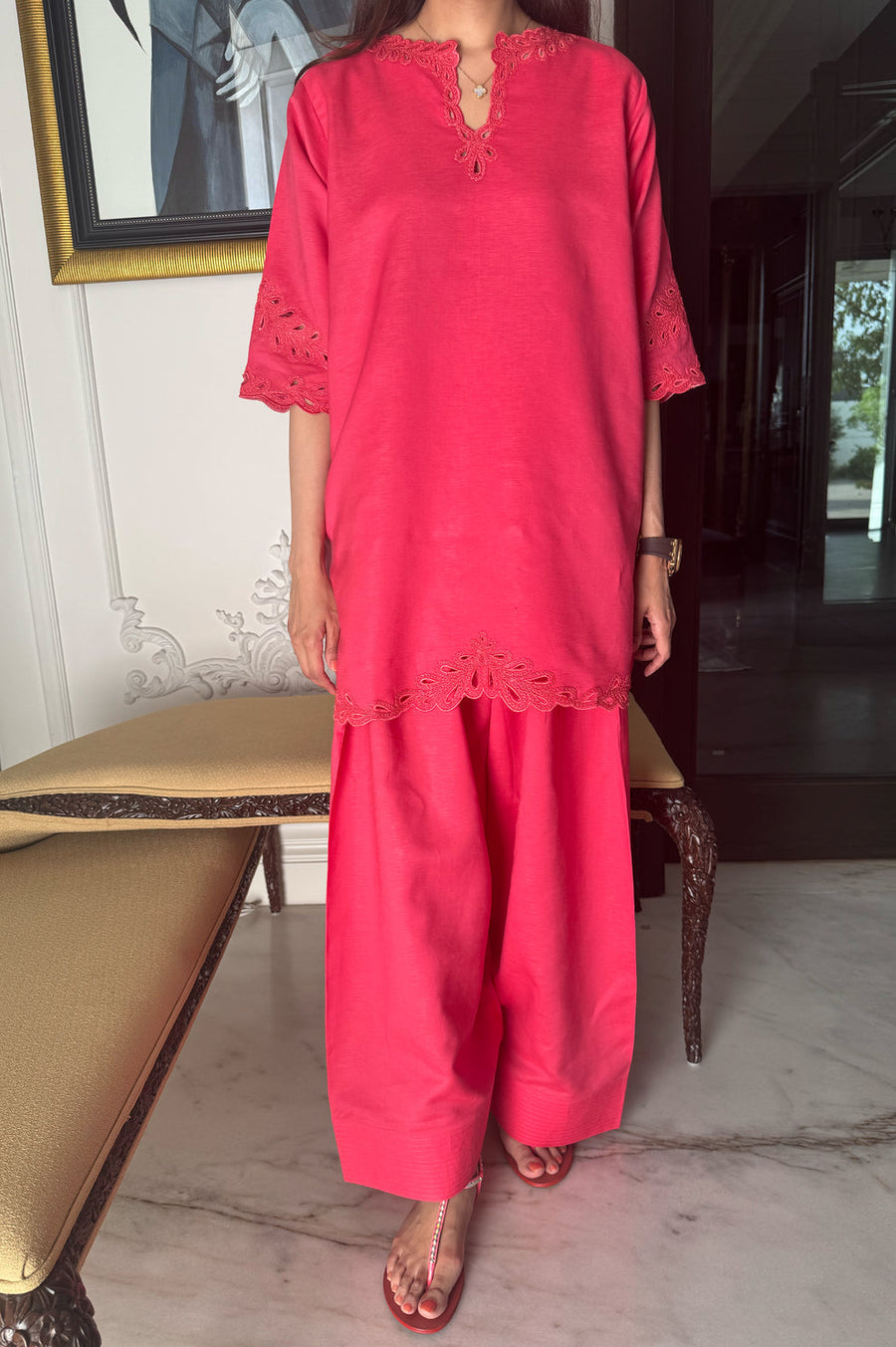 A classic black velvet two-piece featuring a sleek button-down shirt paired with a soft, draped shalwar. The subtle sheen of the velvet adds effortless elegance, making it a timeless festive...