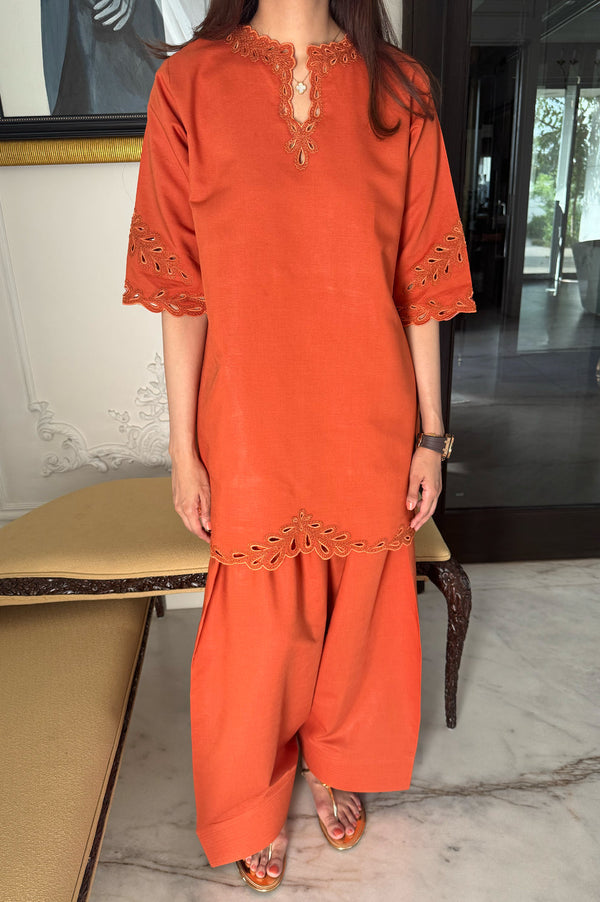 A warm beige velvet outfit adorned with gold sequence motifs for a soft, festive glow. Its relaxed cut and coordinating shalwar create a graceful look perfect for seasonal celebrations.