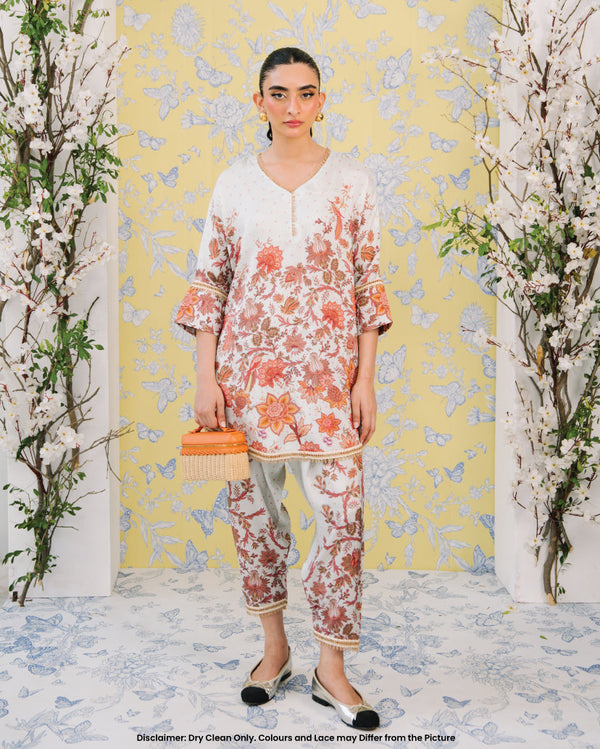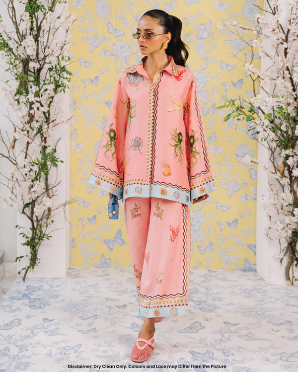 Crafted from luxurious 60-gram silk, this coral co-ord set features vibrant botanical prints, wide statement sleeves, and relaxed trousers.Perfect for festive brunches or garden soirées with a touch of elegance....