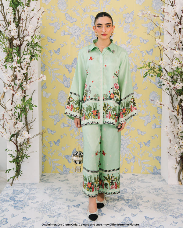 Crafted from luxurious 60-gram silk, this mint green co-ord set features vibrant botanical prints, wide statement sleeves, and relaxed trousers.Perfect for festive brunches or garden soirées with a touch of...