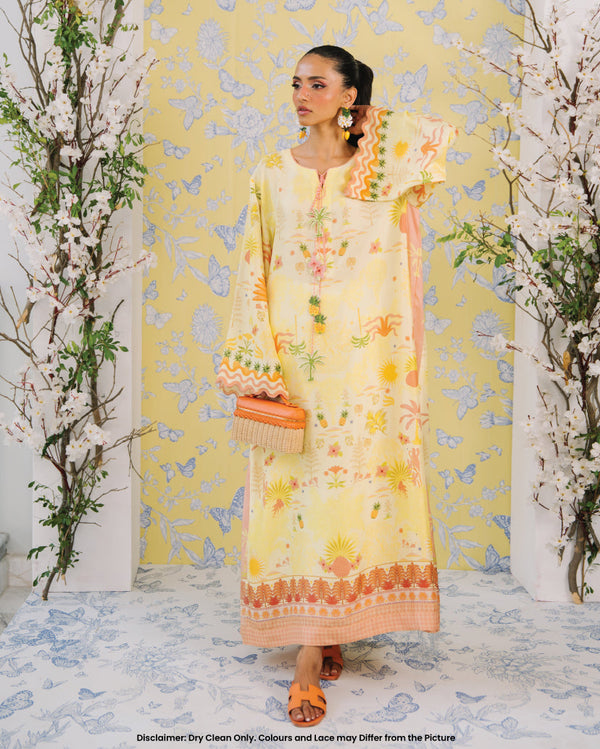 A breezy 60-gram silk ensemble in powder blue, adorned with vibrant pineapples, vines, and florals—framed with playful pink borders. A chic choice for effortless daytime elegance. Model is 5 '4...