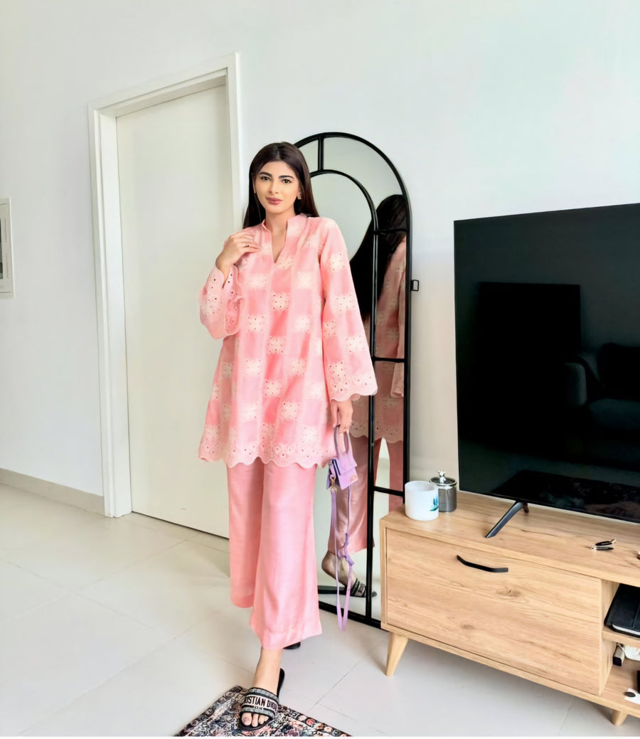 A vibrant yellow ensemble crafted from 60-gram pure raw silk, featuring intricate prints accented with sequins and stone embellishments. Paired with stylish crushed pants for an effortlessly chic look. Finished...