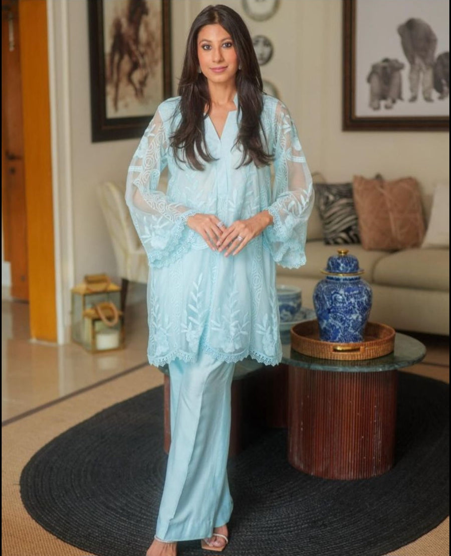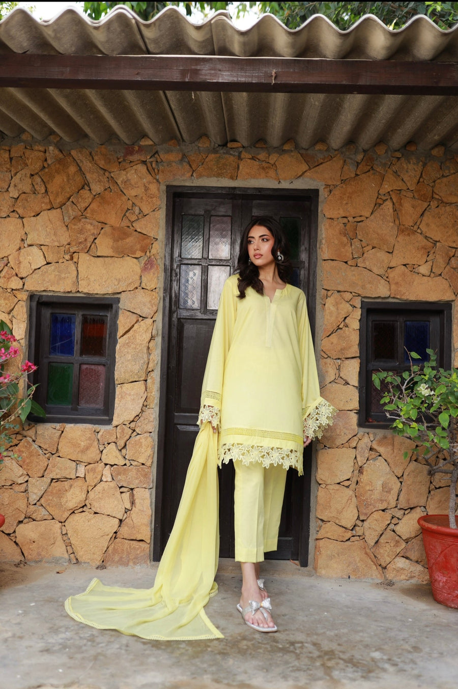 AZURE : Our favourite lime set with some lace details on sleeves and daman paired with straight pants.complete the look with our laced Dupatta.