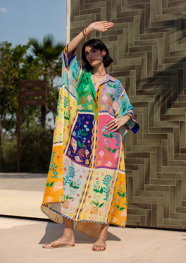 Say hello to Rae, a cover-up kaftan! It is a coastal dream designed for sun-drenched days. Crafted in featherlight crepe, this flowing silhouette glides effortlessly over your swimwear or co-ords,...