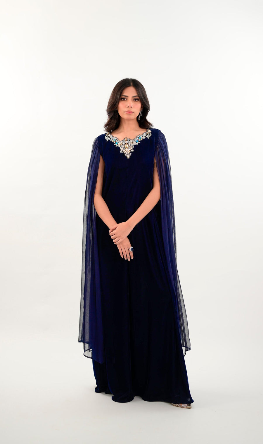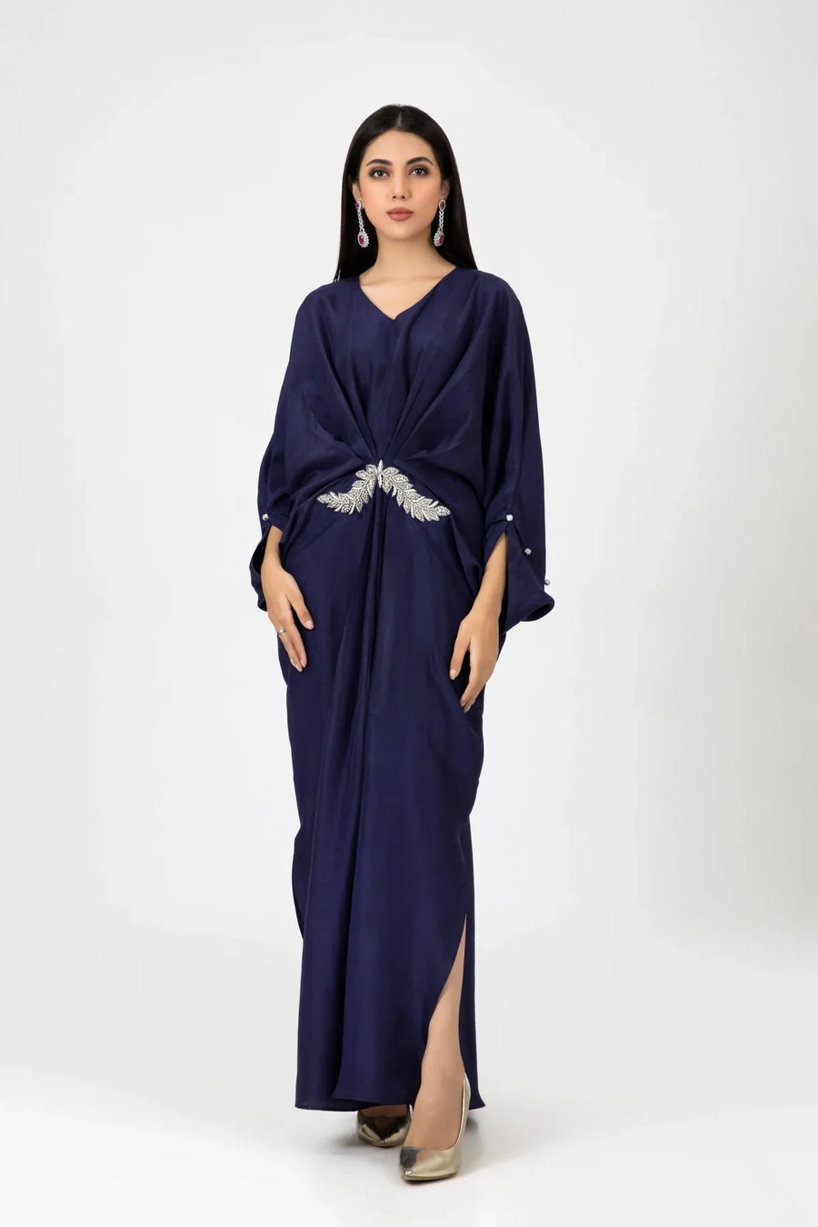 This glamorous kaftan is crafted in luxurious rawsilk featuring a crystal embellished motif front and back. Material: Pure Rawsilk 80gm Pants & Dupatta Sold Separately Colour: Navy Blue Model is...