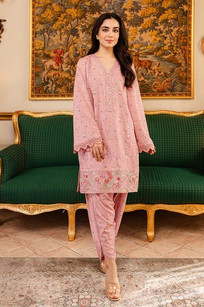 Fabric: Silk lawn2pcPrinted Floral kurta in baby pink base with delicately embroidered borders, paired with tulip pants.