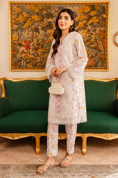 Fabric: Silk lawn2pcWhite base with floral print having heavily embroidered details paired with straight pants.