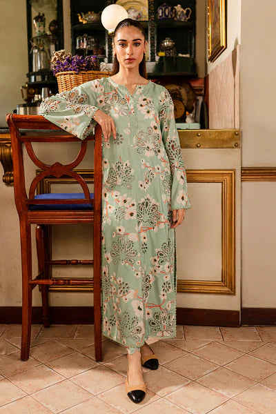 Fabric: lawn silk2pcBeige with forest green printed base in a boxy long kurta with green embroidery details paired with staright pants.