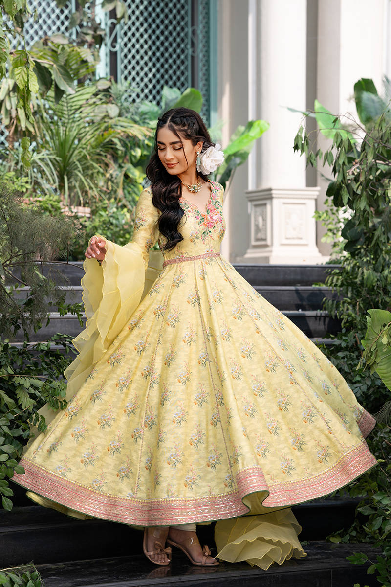 A stunning lemon yellow printed peshwas with embellished V neck-line and embroidered hem borders with fitted churidar sleeves. Completed with ruffled dupatta and paired with ivory raw silk churidar. Front...