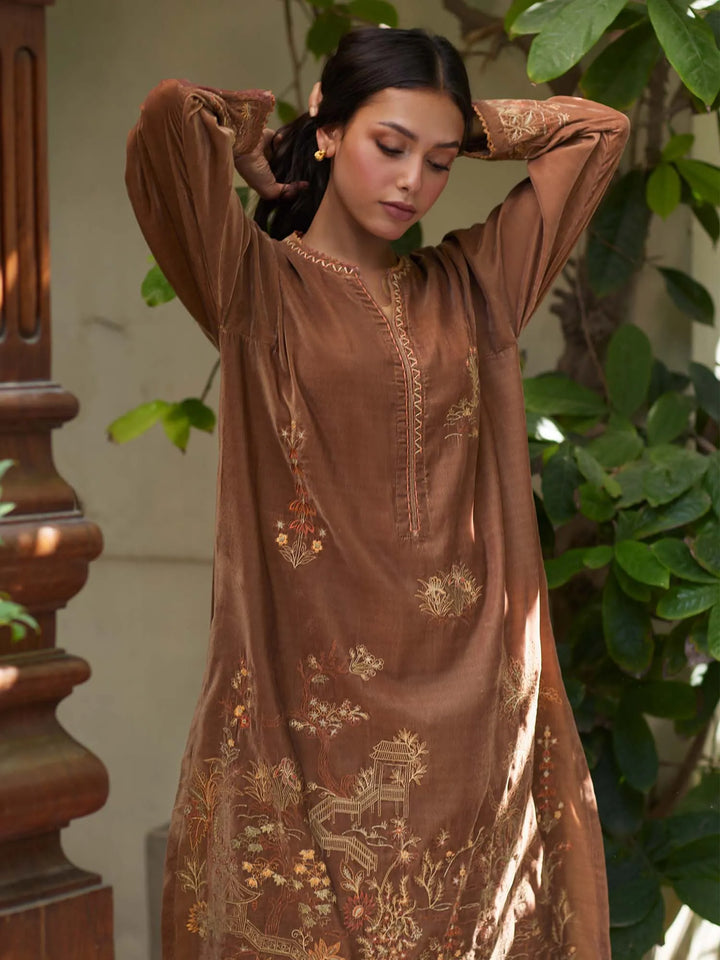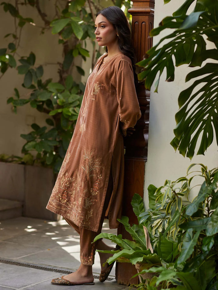 Effortlessly elegant, our brown velvet kurta set features multi resham work with single aari embroidery. A wardrobe essential for the season’s most elegant evenings.
