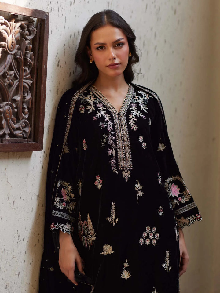 Radiate charm this festive season with our black velvet set, featuring single aari and multi resham embroidery. Perfect for winter soirées, dinners, and all-night celebrations.