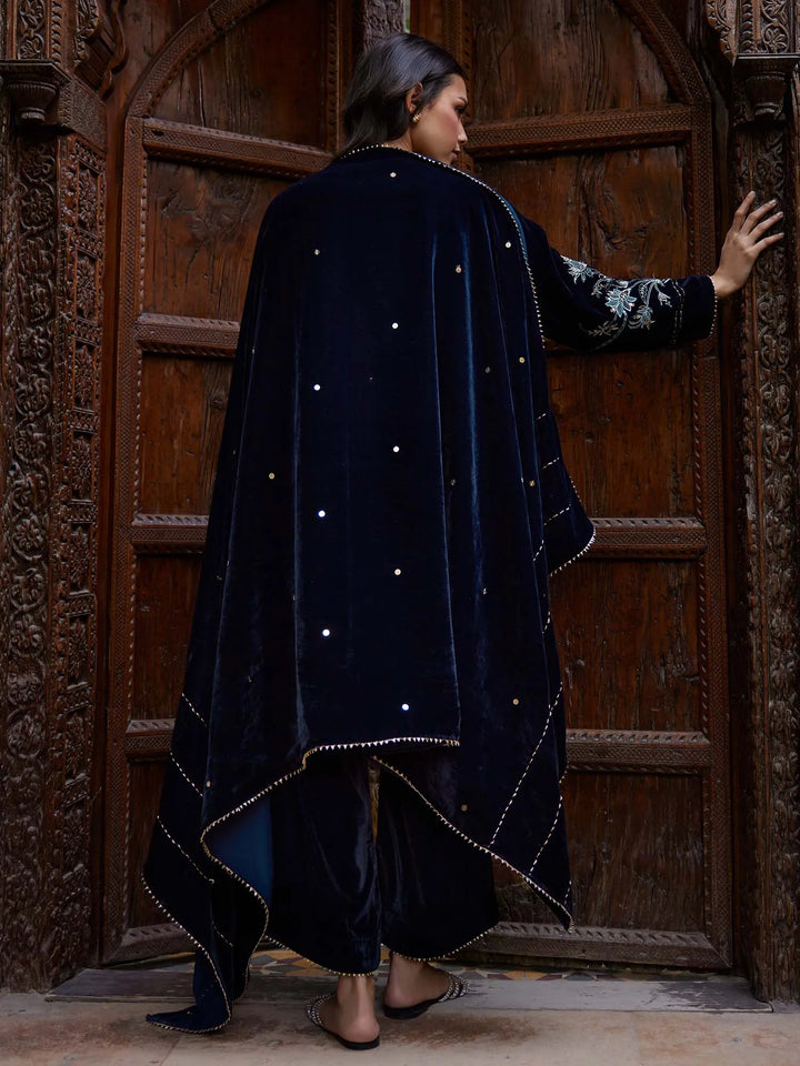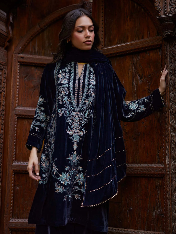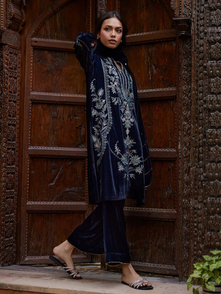 Make a bold statement this winter season with our blue velvet set, embellished with multi-resham work and single aari embroidery. A wardrobe essential for the season’s most elegant evenings.