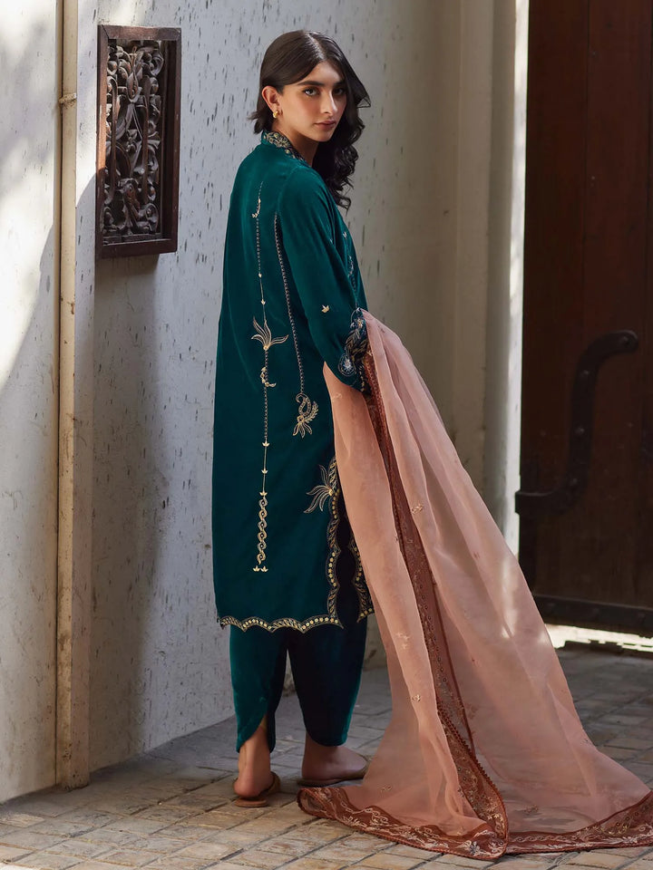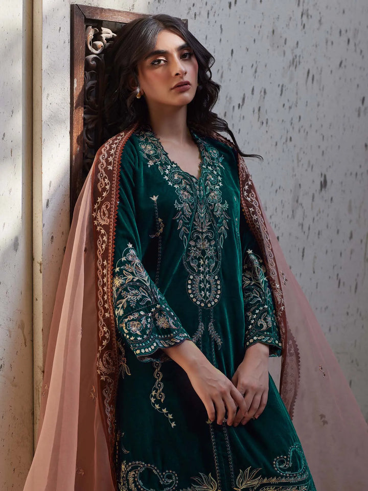 Keep it effortlessly chic with this teal velvet set, showcasing multi-resham and single aari embroidery, essential for winter gatherings and celebrations.