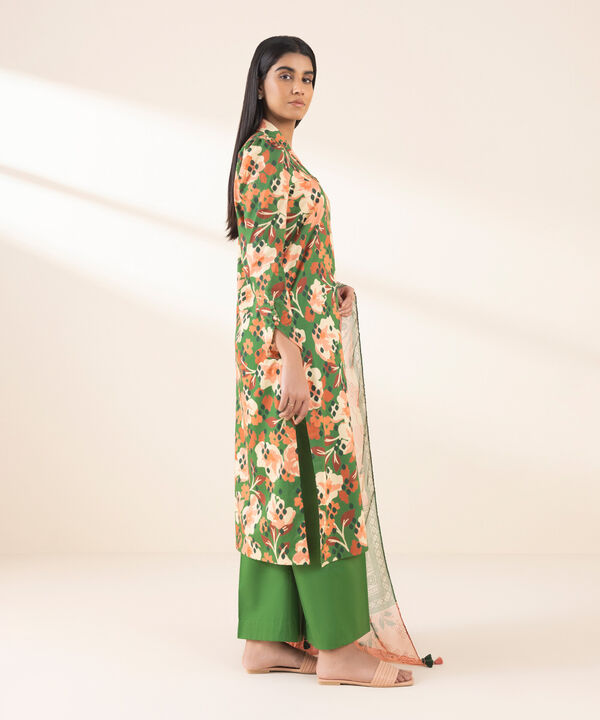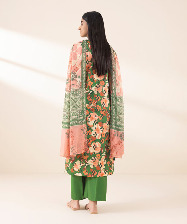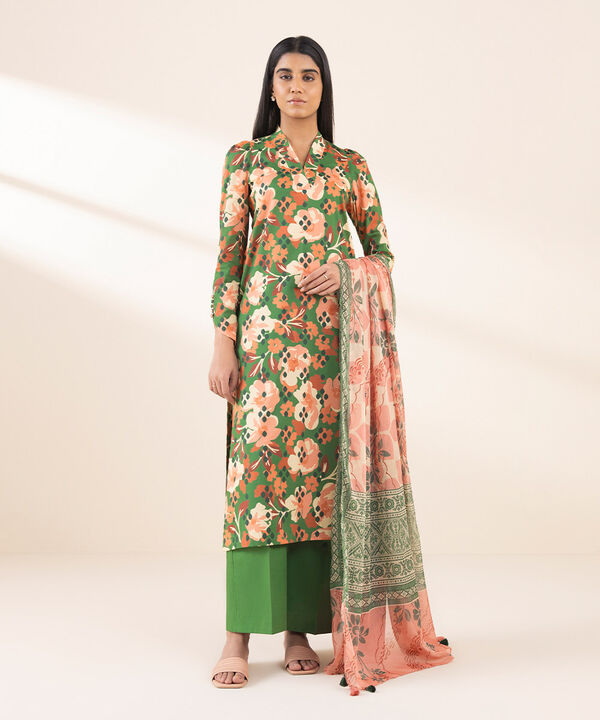 Elevate your everyday style in our green and coral printed, lawn shirt and blended tissue dupatta fabric.