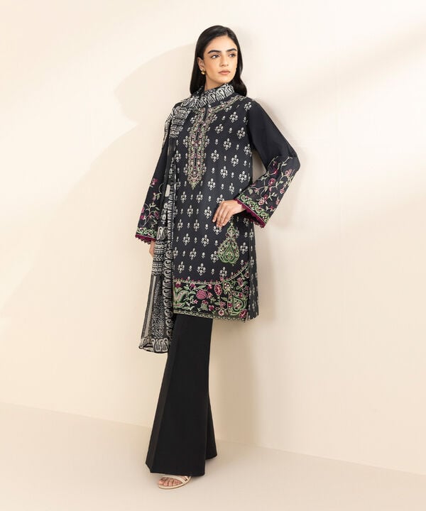 Make a statement in our off white and black lawn three piece embroidered suit with a blended tissue dupatta.