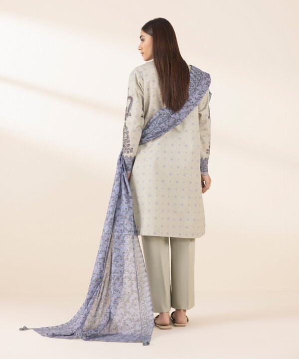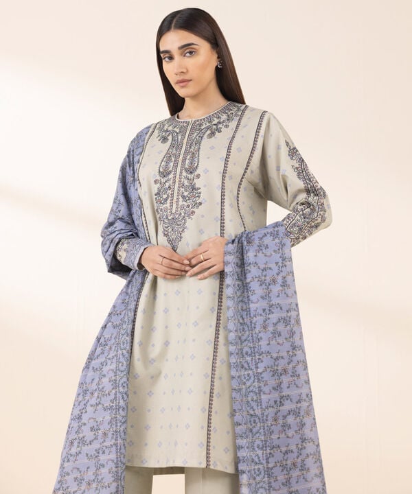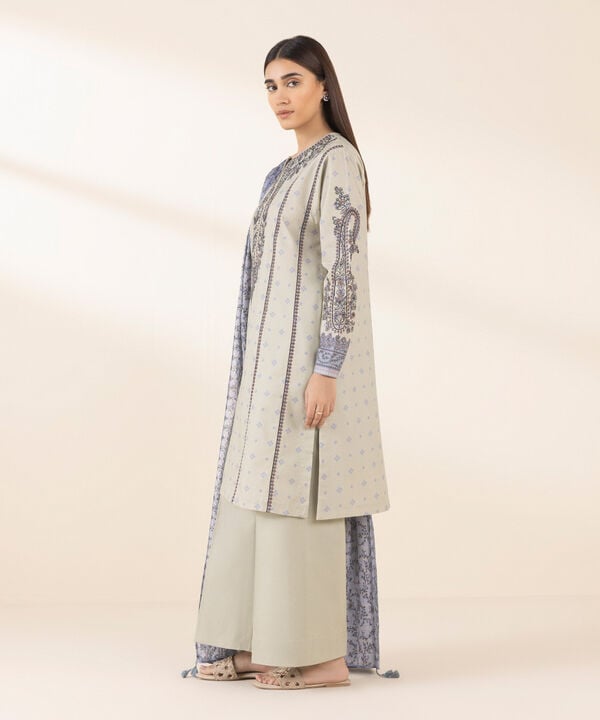 The shirt pairs a printed base with zari embroidery across front, back, and sleeves, framed by coordinated borders for a finished edge. A printed zari-voile dupatta in grey-blue adds lift and movement, while the dyed cotton trouser grounds the palette for all-day wear. Together, the set reads complete, airy, and season-ready.