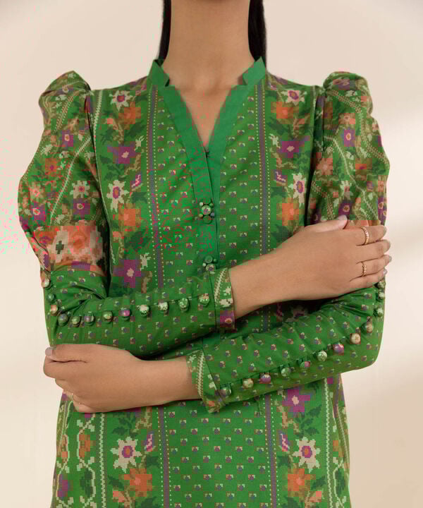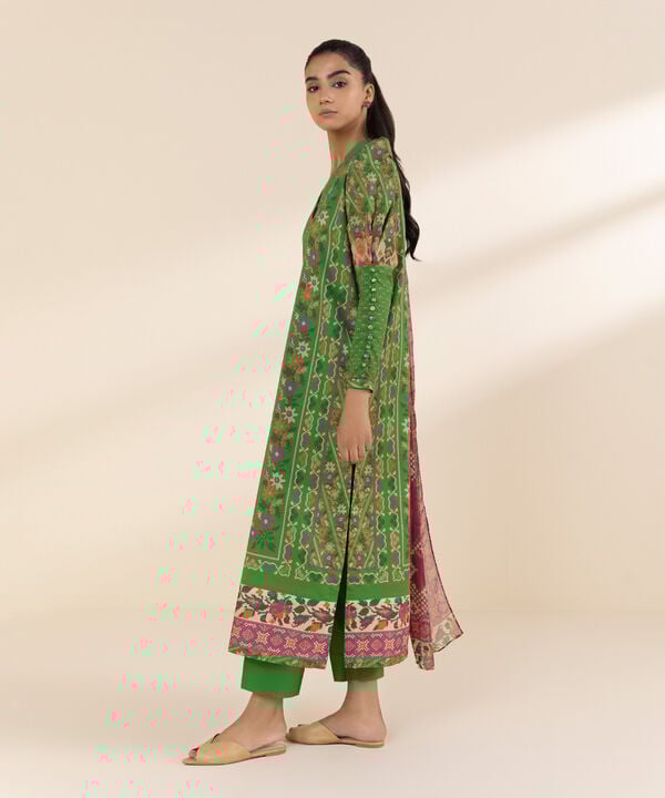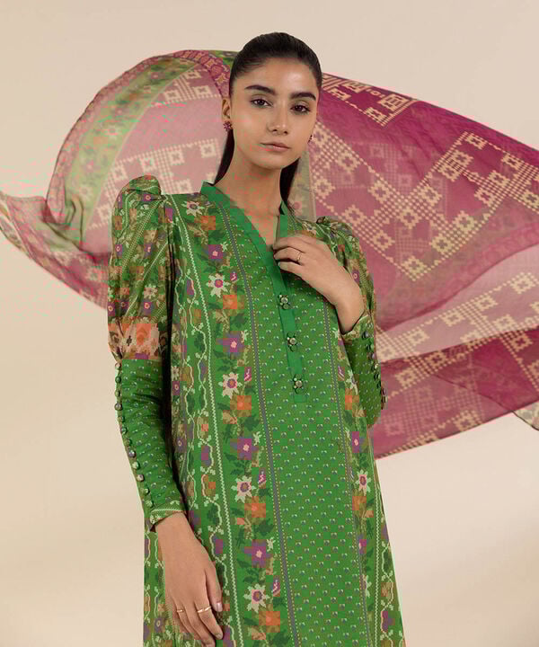 Elevate your seasonal wardrobe with our printed green and fuchsia, lawn three piece suit with a blended chiffon dupatta and cotton trousers.