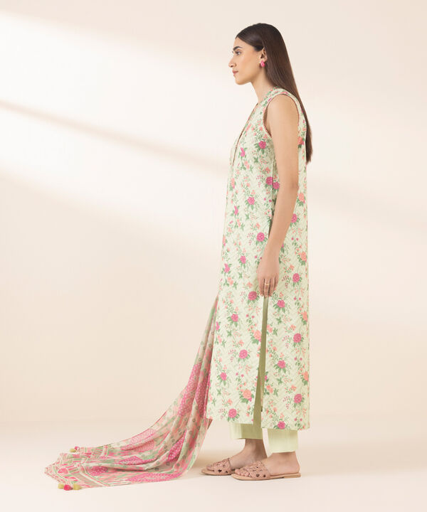 Elevate your seasonal wardrobe with our printed light green and multi-coloured, lawn three piece suit with a blended tissue dupatta and cotton trousers.