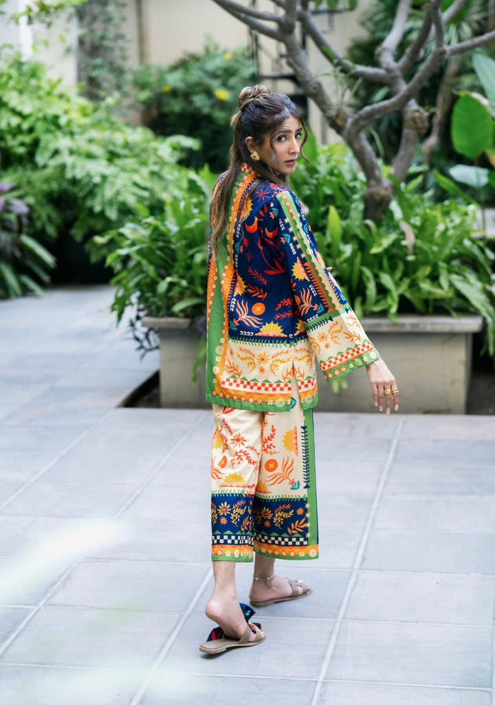 Digital printed set Includes a shirt and pleated pants Crease resistant blended fabric produced in-house Suitable for summers.