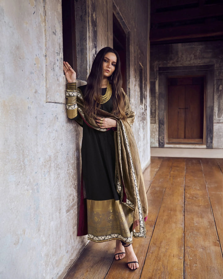 Shirt: Black pure cotton in- house made self-textured long shirt featuring a broad, thick gold banarasi border finished with a layer of intricate embriodery along its edge using thread, zari and sequins work.