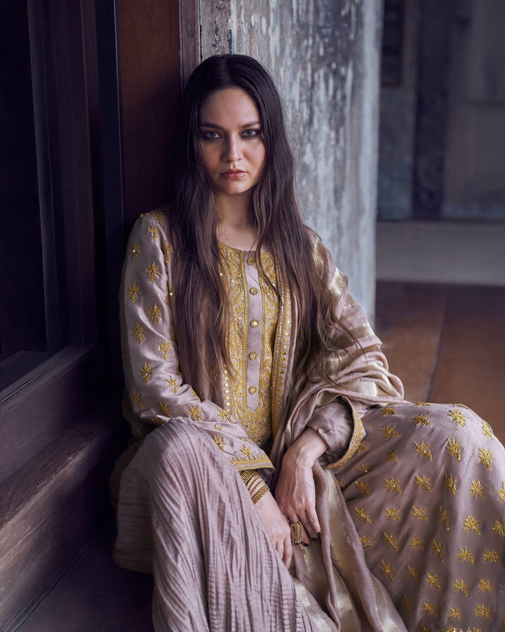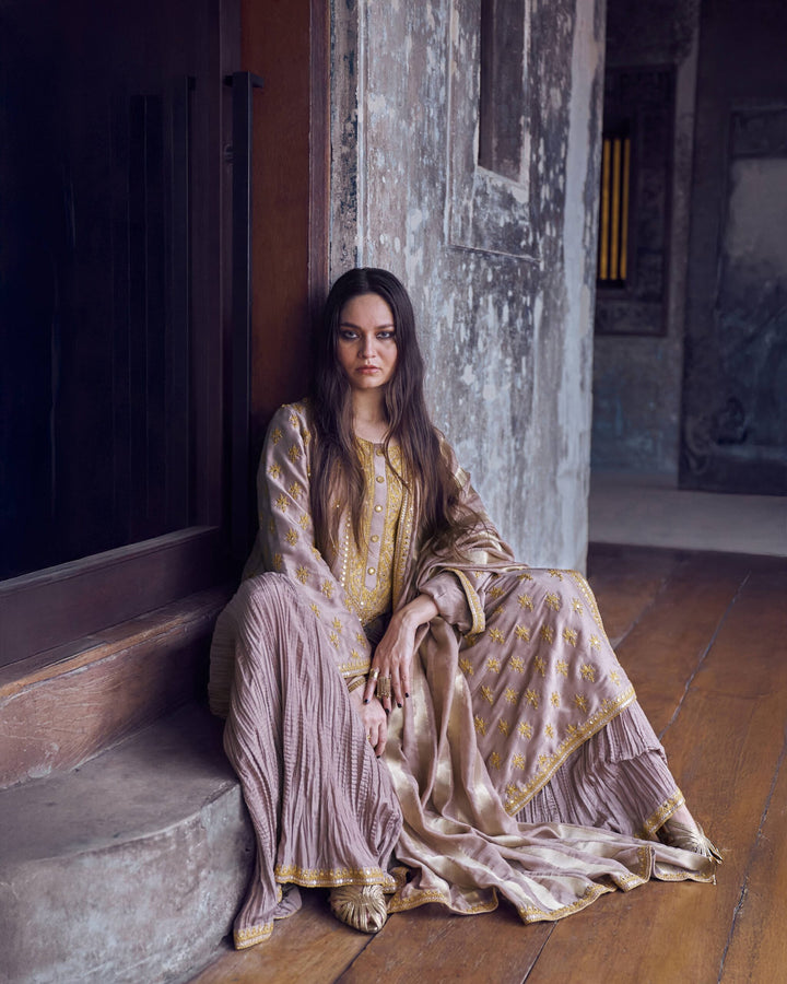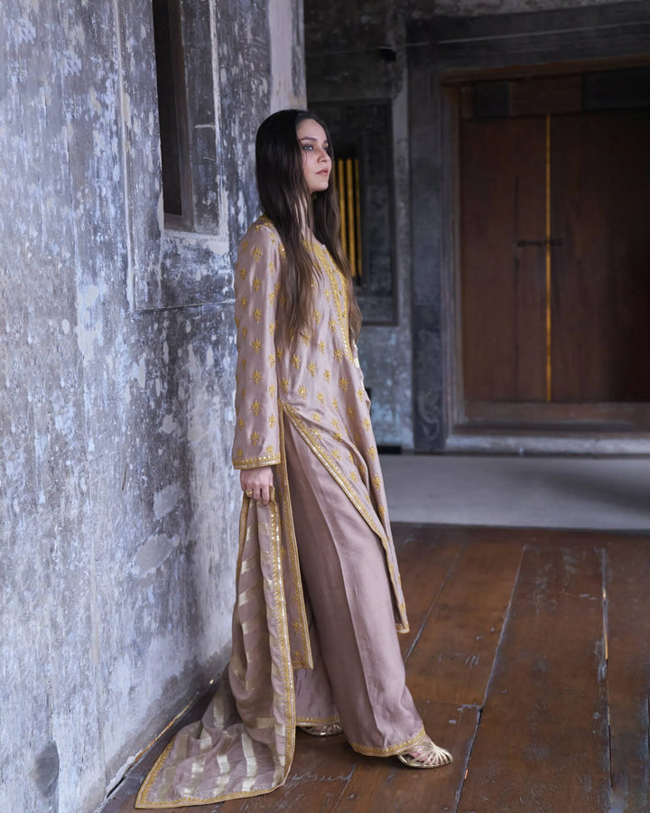Shirt: The shirt is crafted from pure 80 grams raw silk in a sophisticated brick color heavily detailed with marorri and sequins work applied across the entire front, back and sleeves including defined embroidered borders applied to the front and back daman and the side slits.
