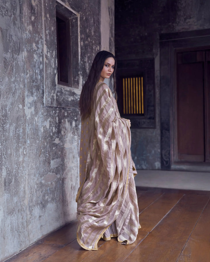 Dupatta: It is crafted in-house made brick colored pure cotton fabric elevated with integrated zari stripes. The edges are finished with marorri and sequins embroidered borders.