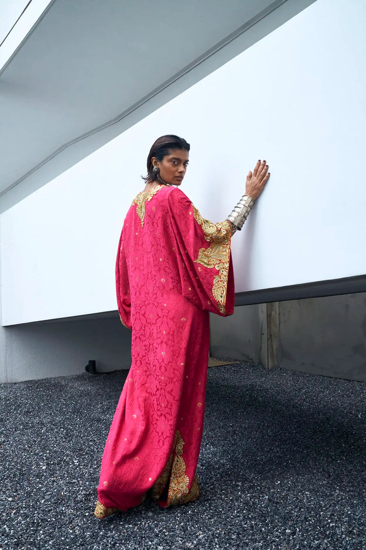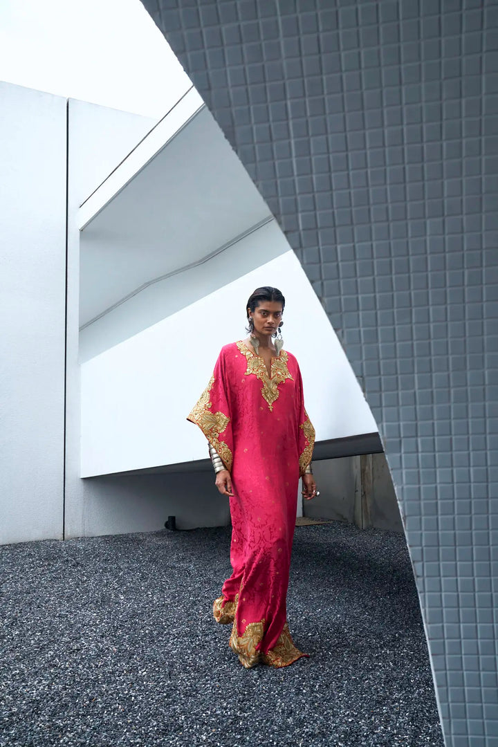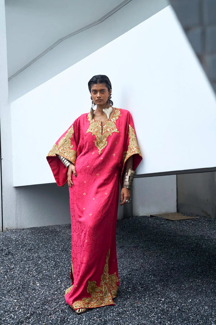 Kaftan: Berry Pink floor length kaftan crafted with self karandi jamawar using techniques of zari embroiderey on front and back neckline, sleeves, side slits and daman.