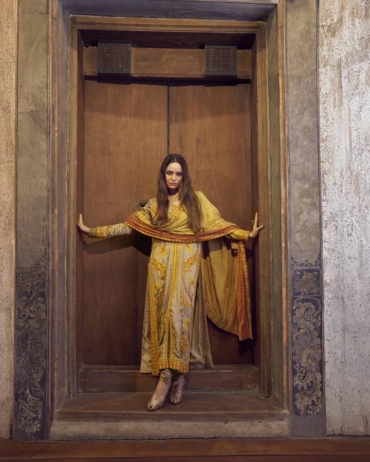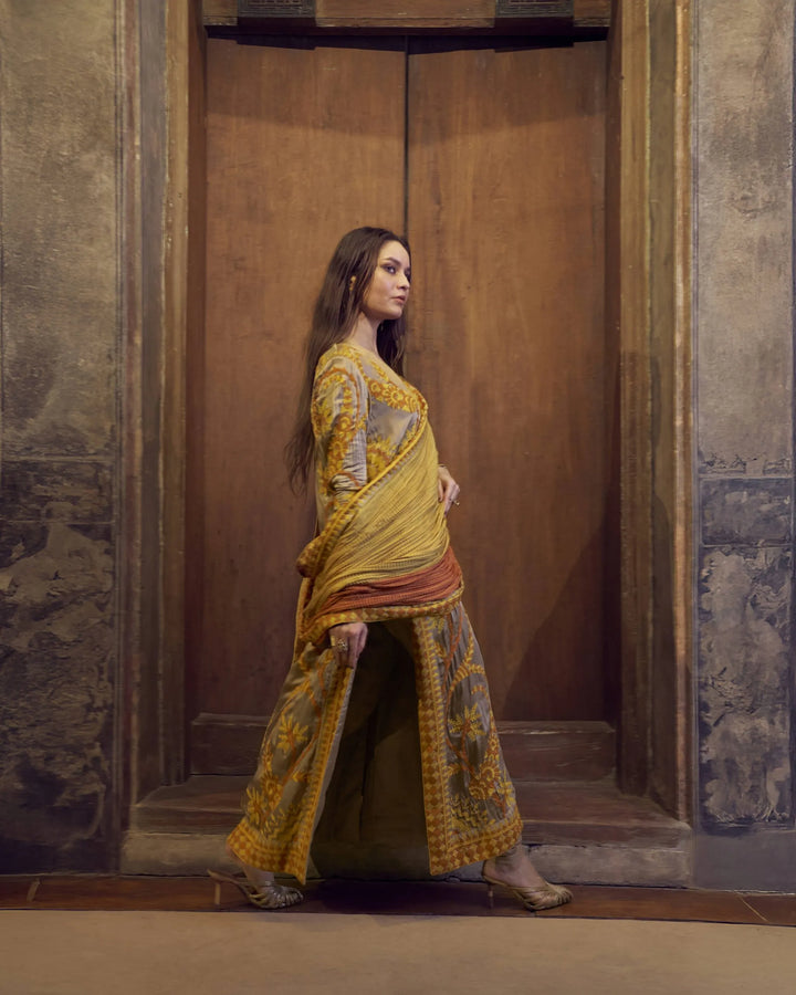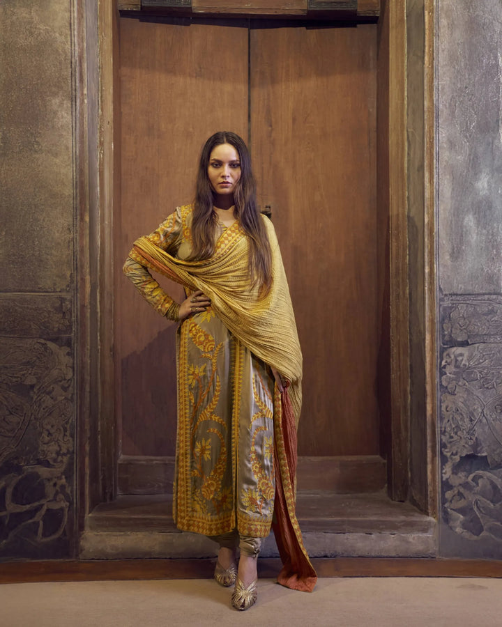 Dupatta: Crafted from a cotton silk blend features a striking crushed (crinkle) finish showcases a vibrant color combination of mustard and rust define by embroidered borders running all over it's edges.
