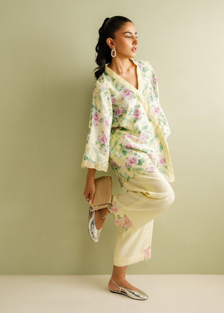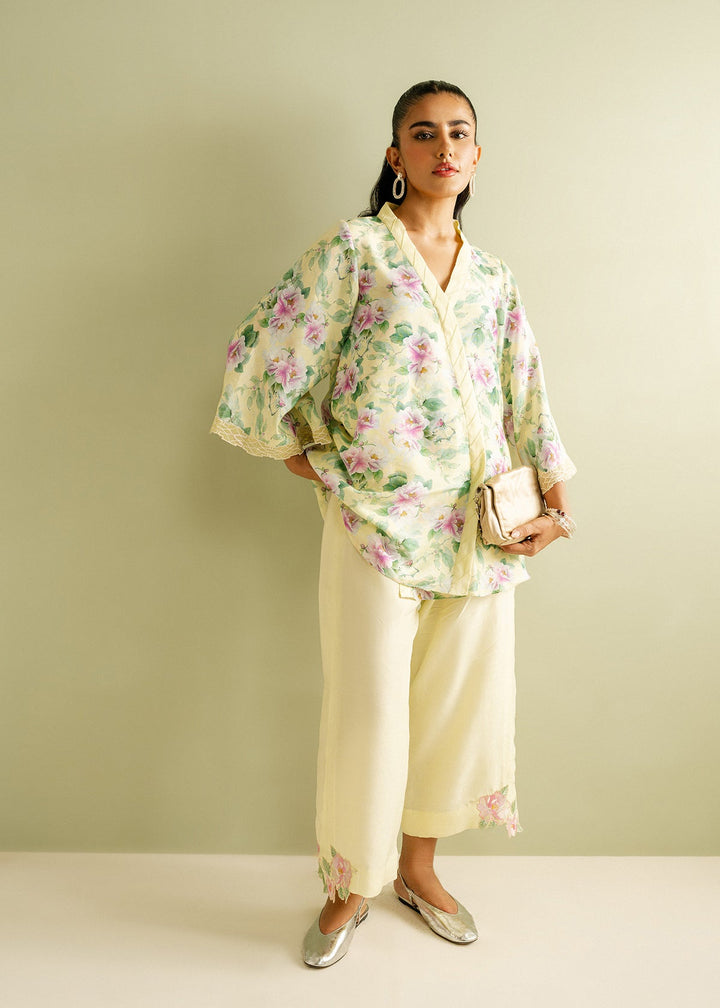 Citrus Chill from Ayana’s Garden — a burst of sunshine wrapped in elegance. Rendered in a refreshing yellow print, this Korean raw silk ensemble blends a sleek silhouette with playful charm. The coordinated shirt and trouser exude a lively yet luxe appeal, capturing the zest of summer days and the serenity of blooming citrus groves.