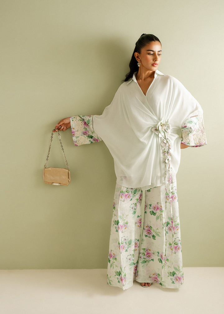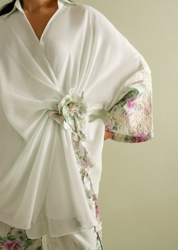 Floral Luxe from Ayana’s Garden — an exquisite blend of mint and ivory, where floral prints bloom in quiet elegance. This chiffon shirt, paired with Korean raw silk trousers, creates a harmonious fusion of lightness and structure. The soft tones and intricate patterns evoke a sense of serene luxury, perfect for those who cherish timeless beauty.