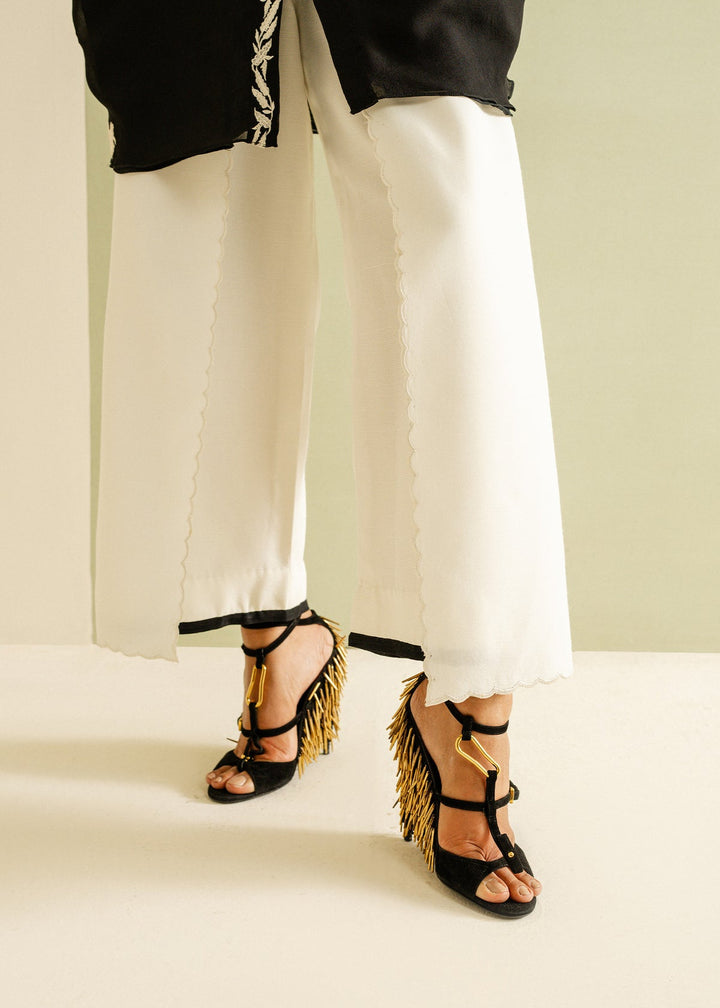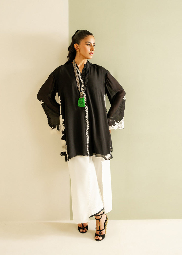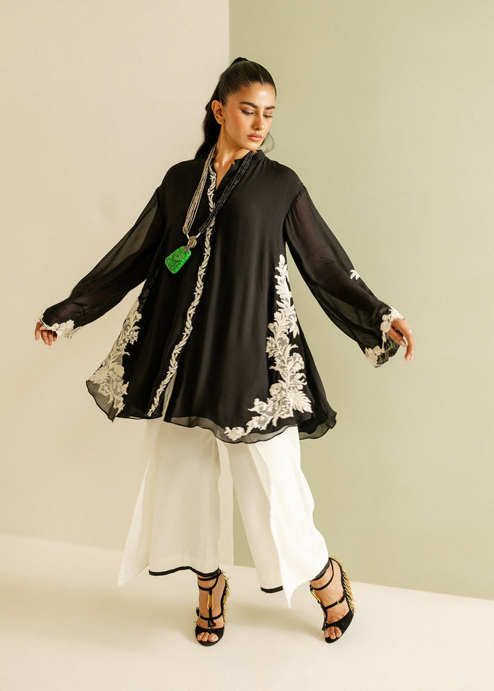 Monochrome Flow from Ayana’s Garden — where bold contrast meets delicate charm. This black and white ensemble features a flowing chiffon shirt, striking in its simplicity, paired with structured raw silk trousers for a sleek silhouette. Whether styled with a plain or subtly sprayed dupatta, the look captures effortless elegance with a modern monochrome twist.