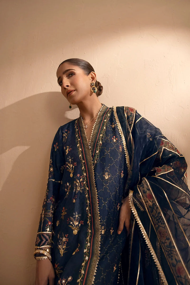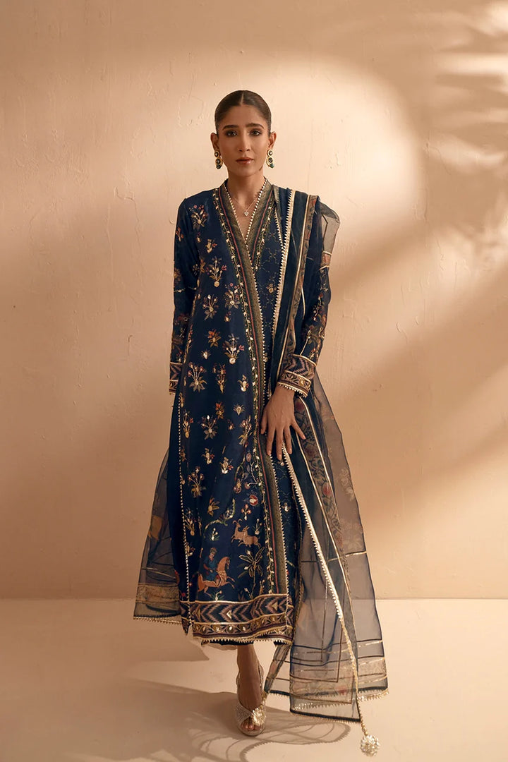 Exude timeless elegance in this traditional angarkha silhouette, Azdeh. Featuring floral and shikargarh imagery and detailed with gotta along the shirt front and borders, Azdeh is a sure shot head turner. Pair it with a diaphanous organza dupatta that flows in a dreamy blend of rich royal colours, finished with gotta details.