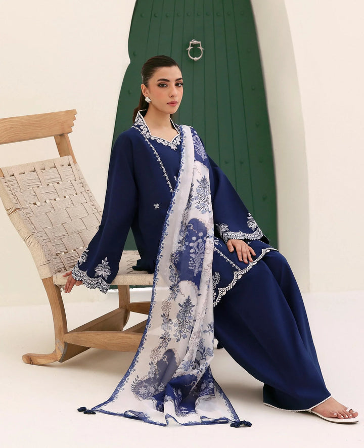 Dahlia features a timeless navy blue hue that embodies both elegance and sophistication. The short-length shirt is beautifully adorned with white-on-blue embroidery and detailed with scalloped sleeves, creating a refined yet modern look. It is paired with a white silk printed dupatta finished with 4-sided tassels and complemented by a classic farshi shalwar. Crafted from premium cambric and silk fabrics, this ensemble perfectly blends traditional charm with contemporary finesse.