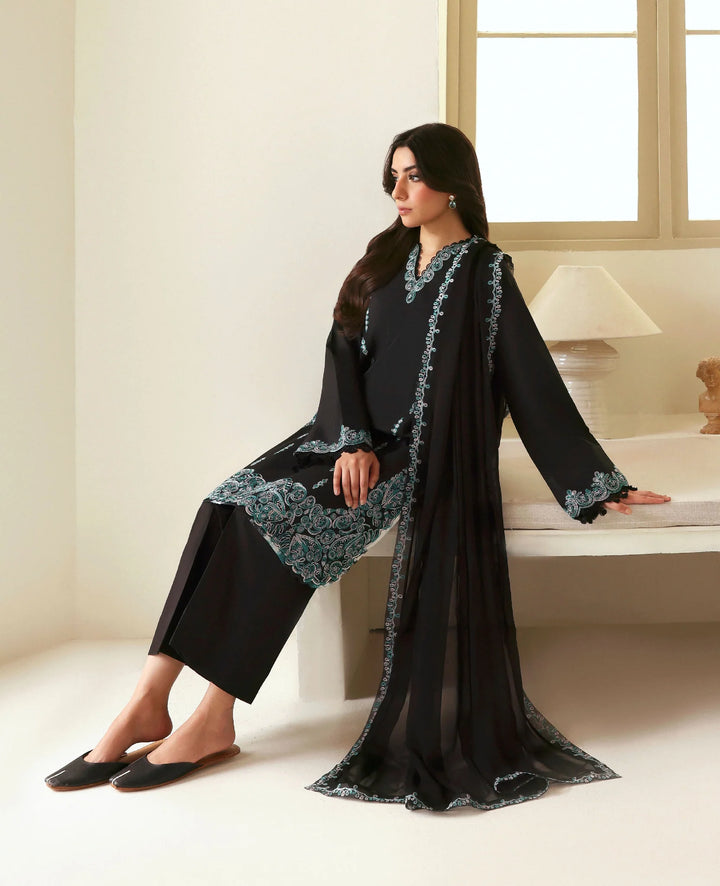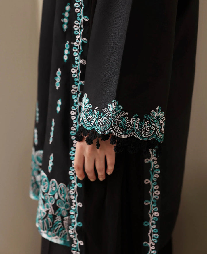 A contemporary black ensemble defined by its refined simplicity and artistic embroidery. The short paneled shirt features delicate dori-style embroidery in soft hints of aqua and blue, complemented by embroidered sleeves and neckline for a touch of elegance. Paired with black cambric culottes and a chiffon dupatta adorned with a 4-sided embroidered border, Noir exudes effortless sophistication and modern charm.