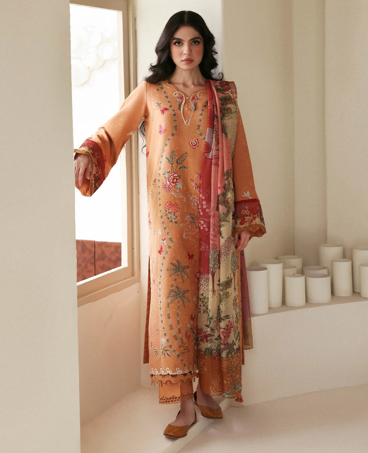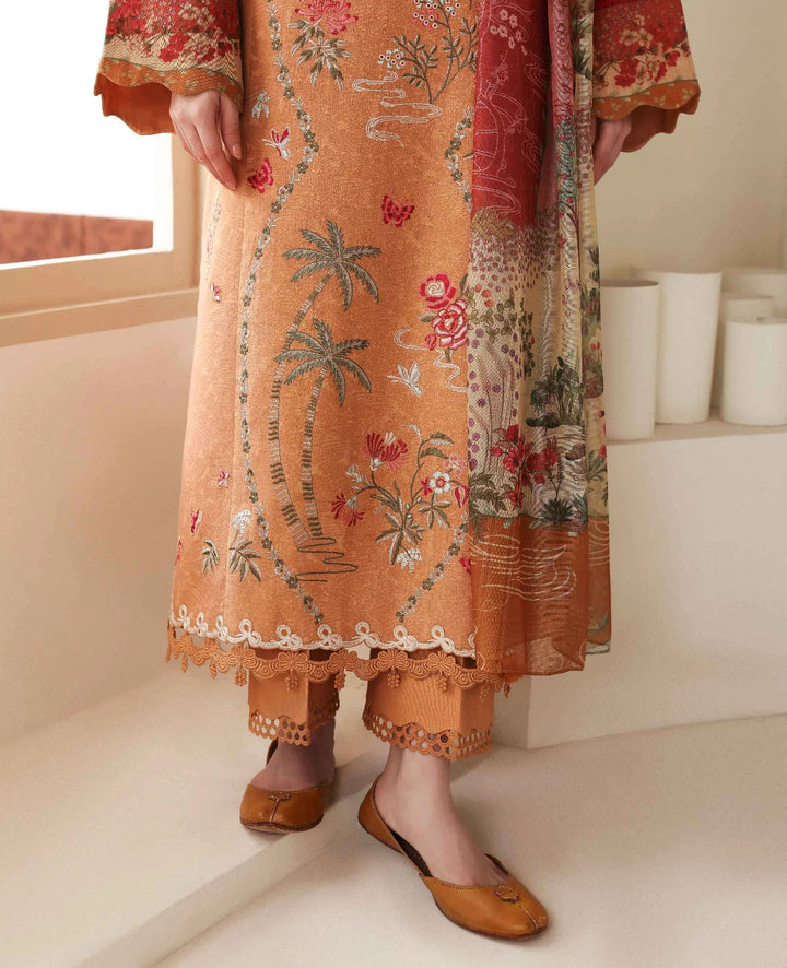A long-length, 3-paneled shirt crafted from luxurious self-jacquard fabric, adorned with Parsigara embroidery on the side panels in vibrant hints of red, coral, and green, bringing depth and artistic flair to the design. The printed sleeve border adds a subtle touch of sophistication, while the printed slub monar dupatta features sectional color blocking for a modern yet graceful aesthetic. Finished with delicate lace detailing that enhances its feminine charm and paired with a cambric trouser, Orlane beautifully balances traditional craftsmanship with contemporary elegance.