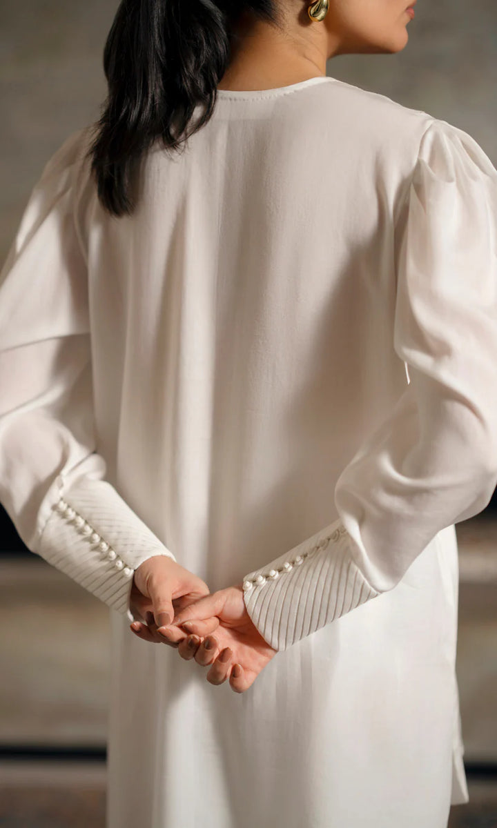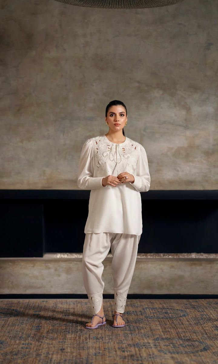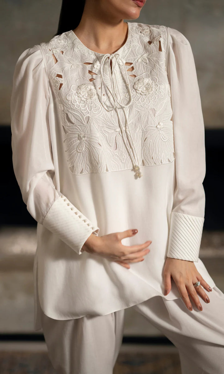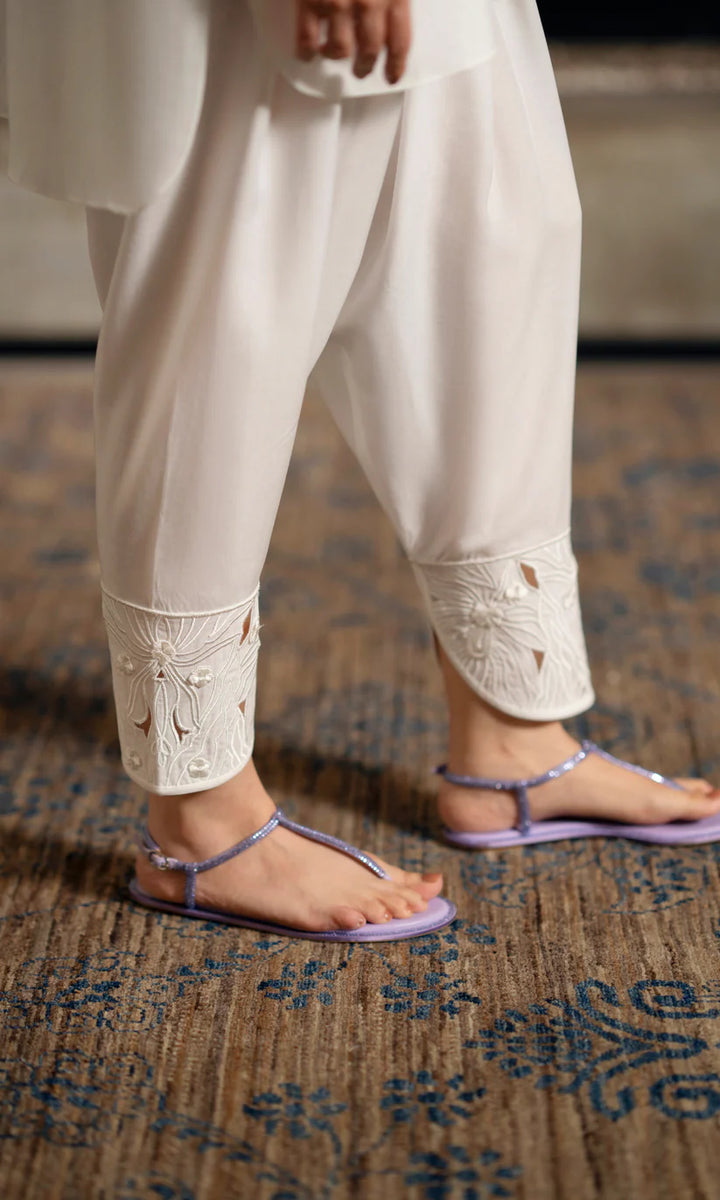 This ensemble features delicate floral embroidery with cutwork along the yoke, paired with softly pleated sleeves finished with fabric-covered buttons. The matching shalwar is detailed with tonal embroidery and cutouts at the hem.