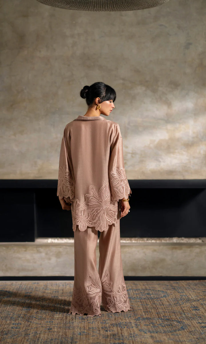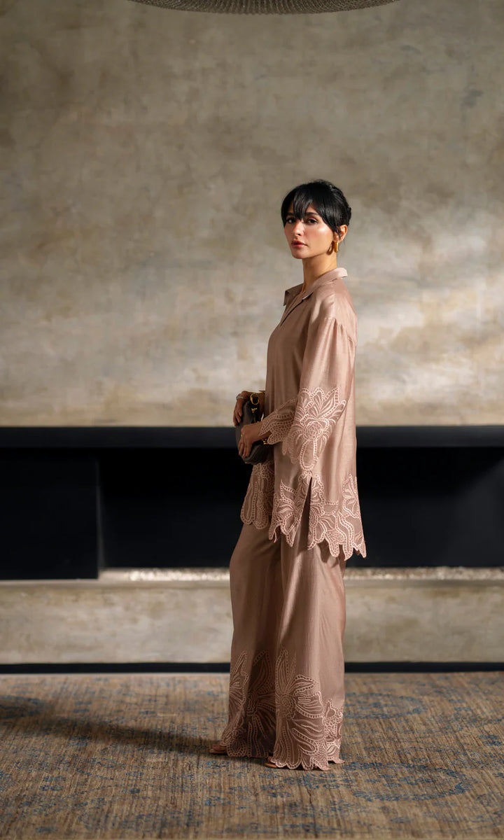 Crafted in a muted blush tone, this relaxed silhouette features oversized floral cutwork embroidery along the hem, sleeves, and trousers. The flowing structure and intricate detailing strike the perfect balance between ease and refinement.