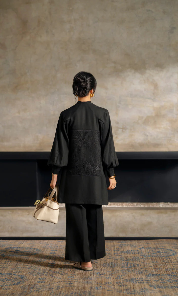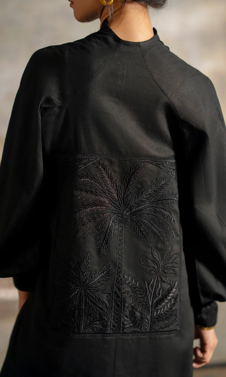 Crafted from pure linen, this black ensemble is defined by its dramatic back panel—tone-on-tone embroidery layered with organza cutwork that creates a subtle, see-through effect. The structured neckline and billowing sleeves balance the fluid silhouette, making it a versatile statement piece.