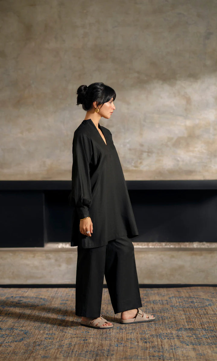 Crafted from pure linen, this black ensemble is defined by its dramatic back panel—tone-on-tone embroidery layered with organza cutwork that creates a subtle, see-through effect. The structured neckline and billowing sleeves balance the fluid silhouette, making it a versatile statement piece.