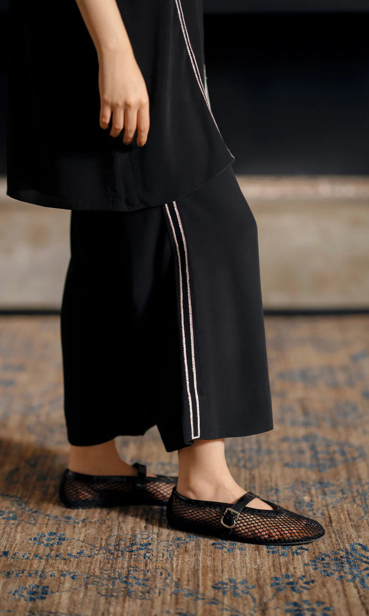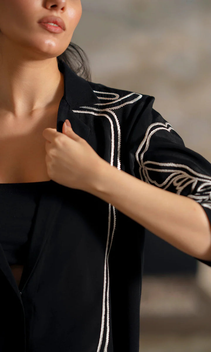 Crafted from luxurious crepe, this black ensemble is elevated with ivory embroidery running across the sleeves and down the seams. The structured jacket paired with wide-leg trousers strikes the perfect balance between boldness and refinement.