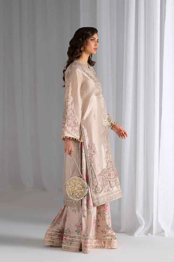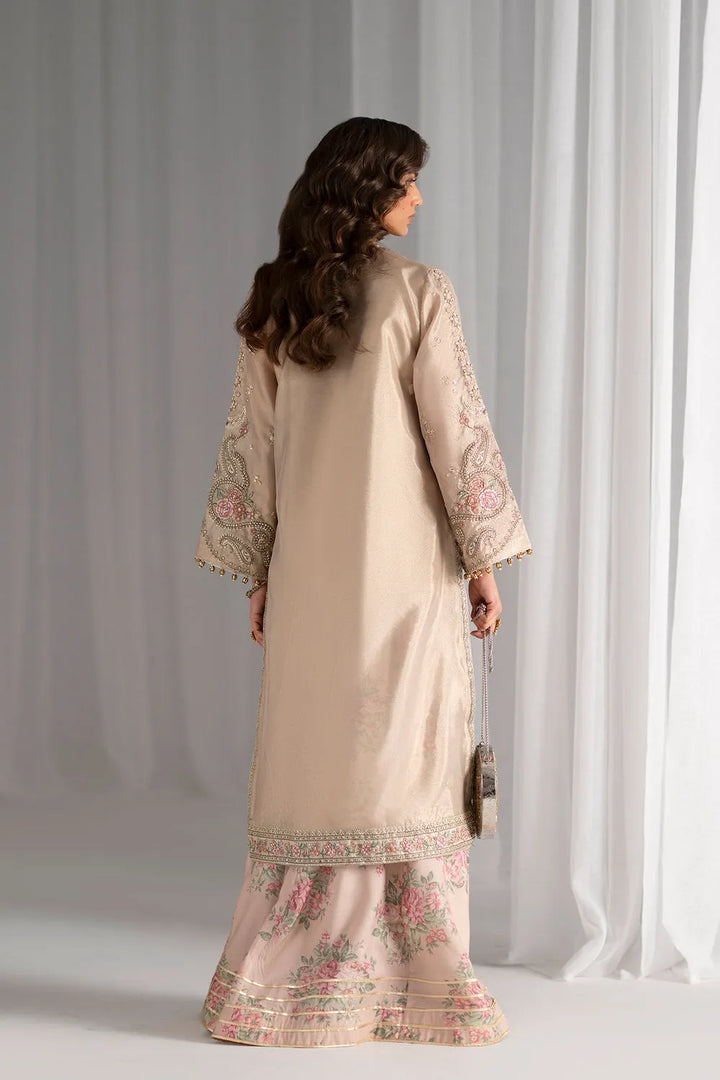 This ethereal ensemble radiates understated luxury in shimmering light beige and champagne silk. The tunic showcases elaborate embroidery concentrated down the center front and neckline, featuring grand paisley patterns executed in subtle metallic silver and gold threads, delicate beads, and soft rose pink and muted green accents. Full-length sleeves with gentle flare at the cuffs are adorned with matching embroidery and finished with delicate gold tassel-like embellishments. The straight, elongated cut extends well past the knees, creating an elegant drape. Paired with flowing wide-legged sharara, this refined composition balances ornate detailing with minimalist silhouettes. Perfect for formal celebrations, weddings.