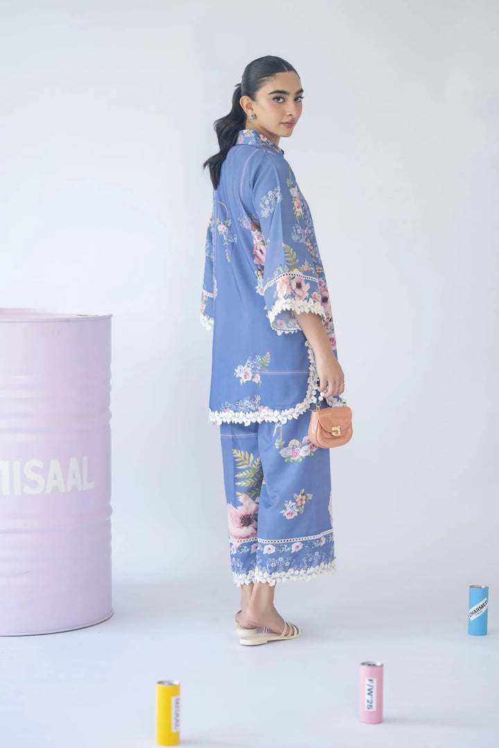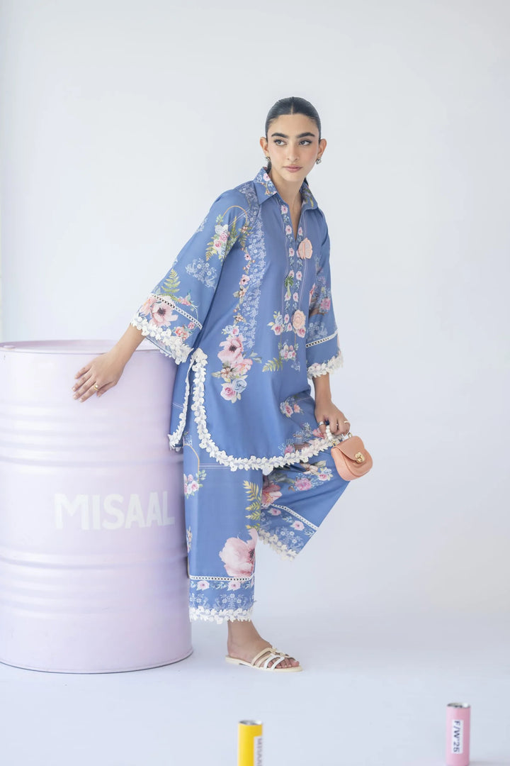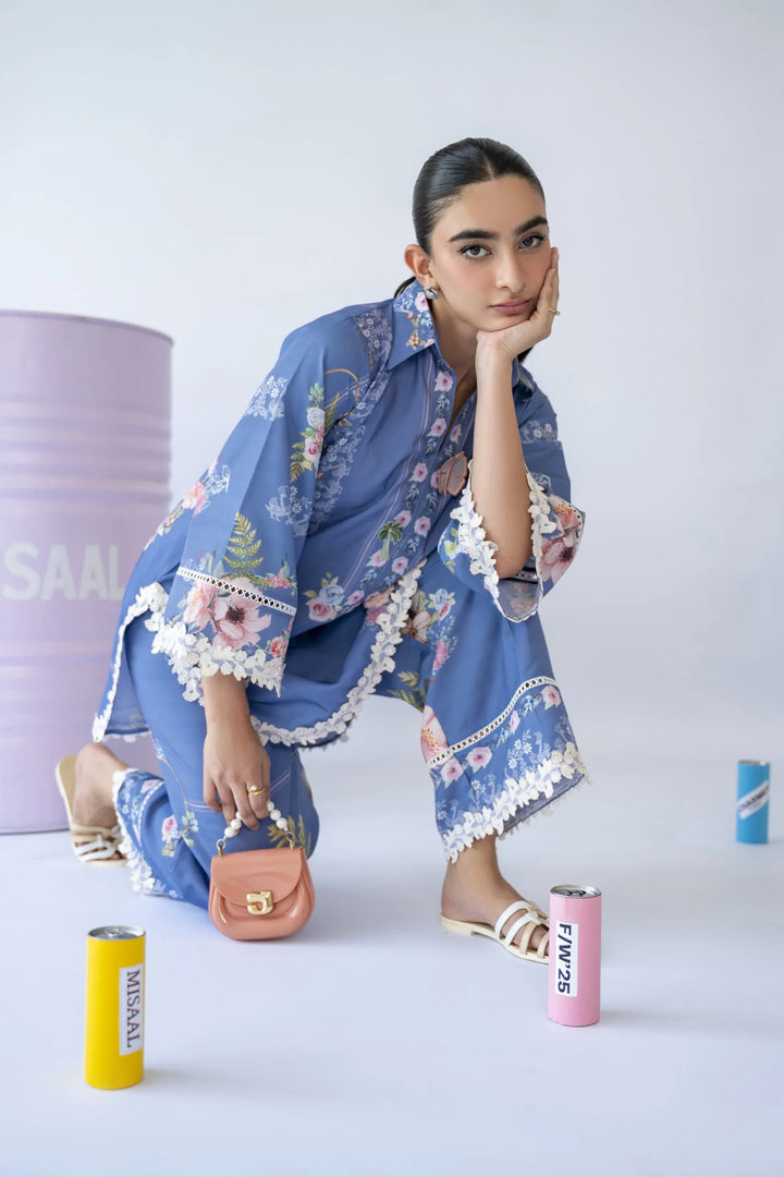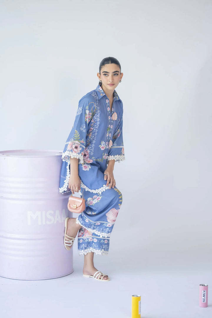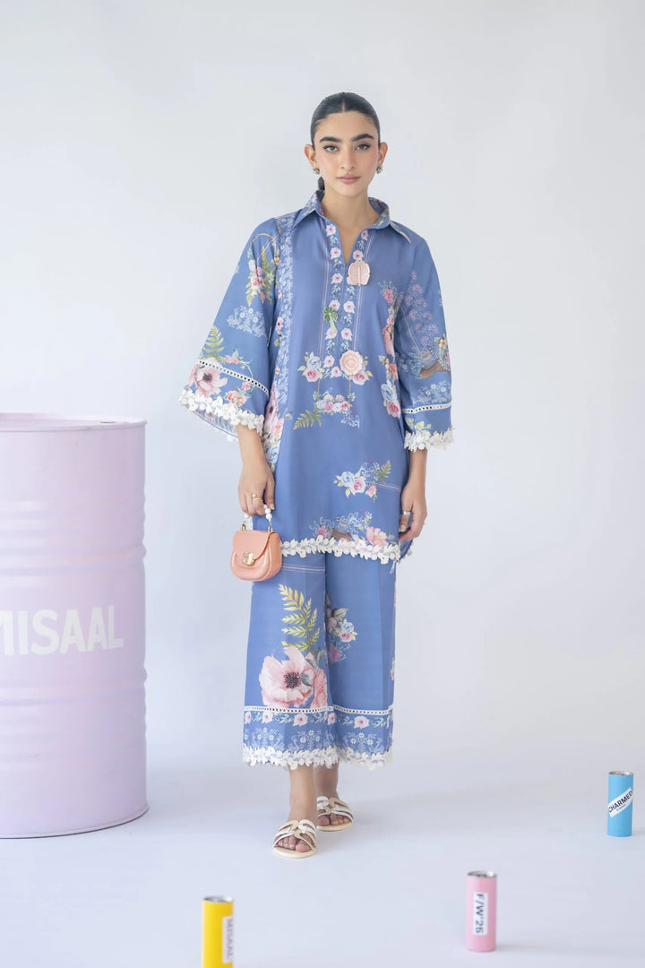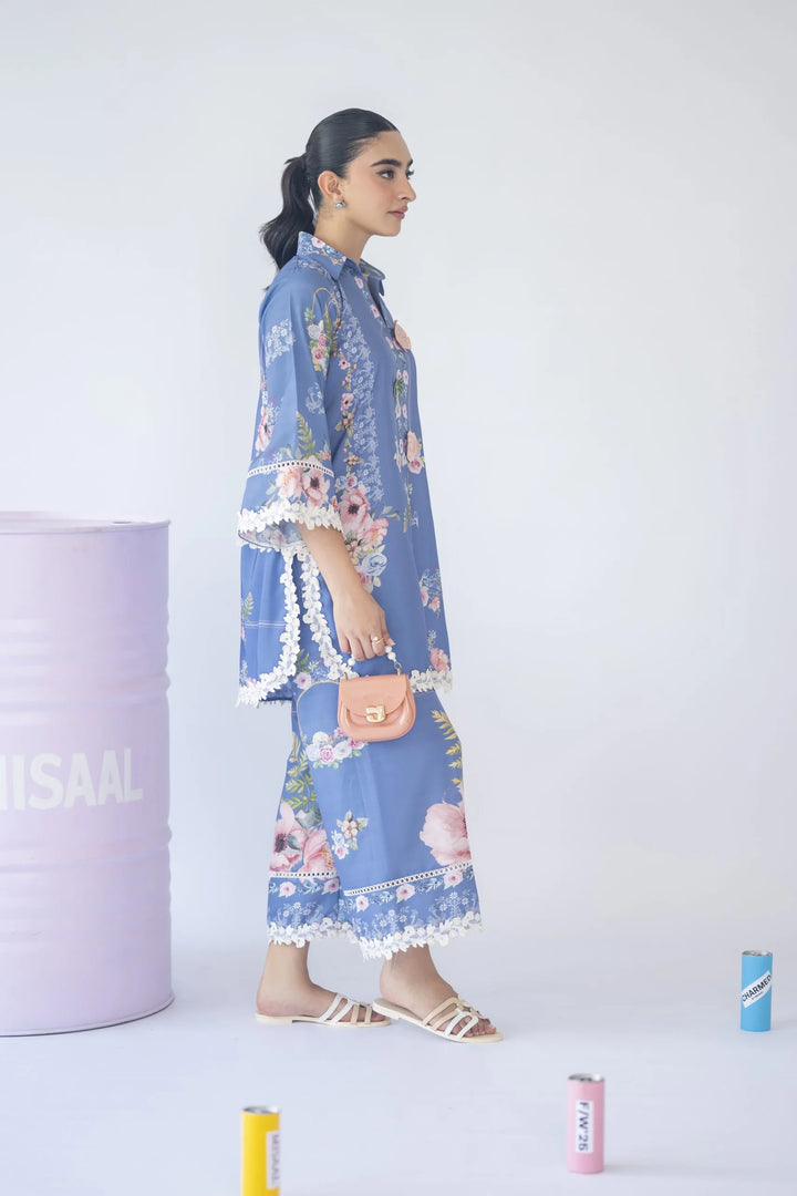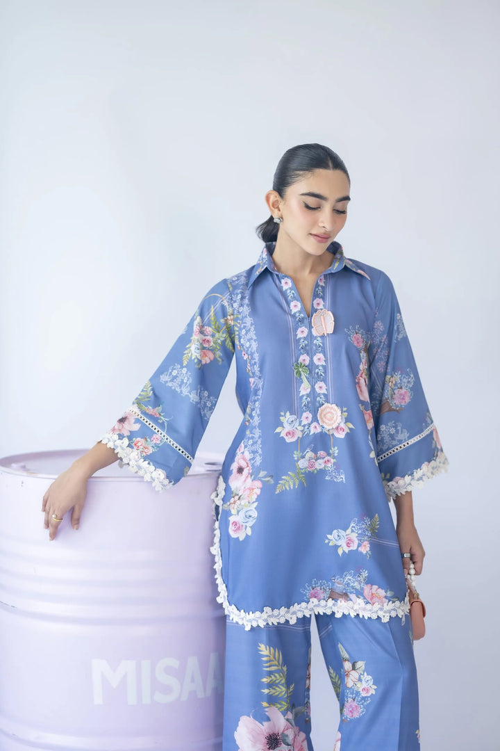 A floral print two-piece set featuring a 3D motif on the neckline and delicate white 3D lace inserts on the sleeves and culottes — feminine, fresh, and effortlessly chic.